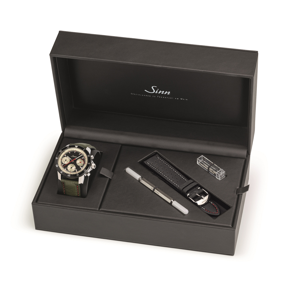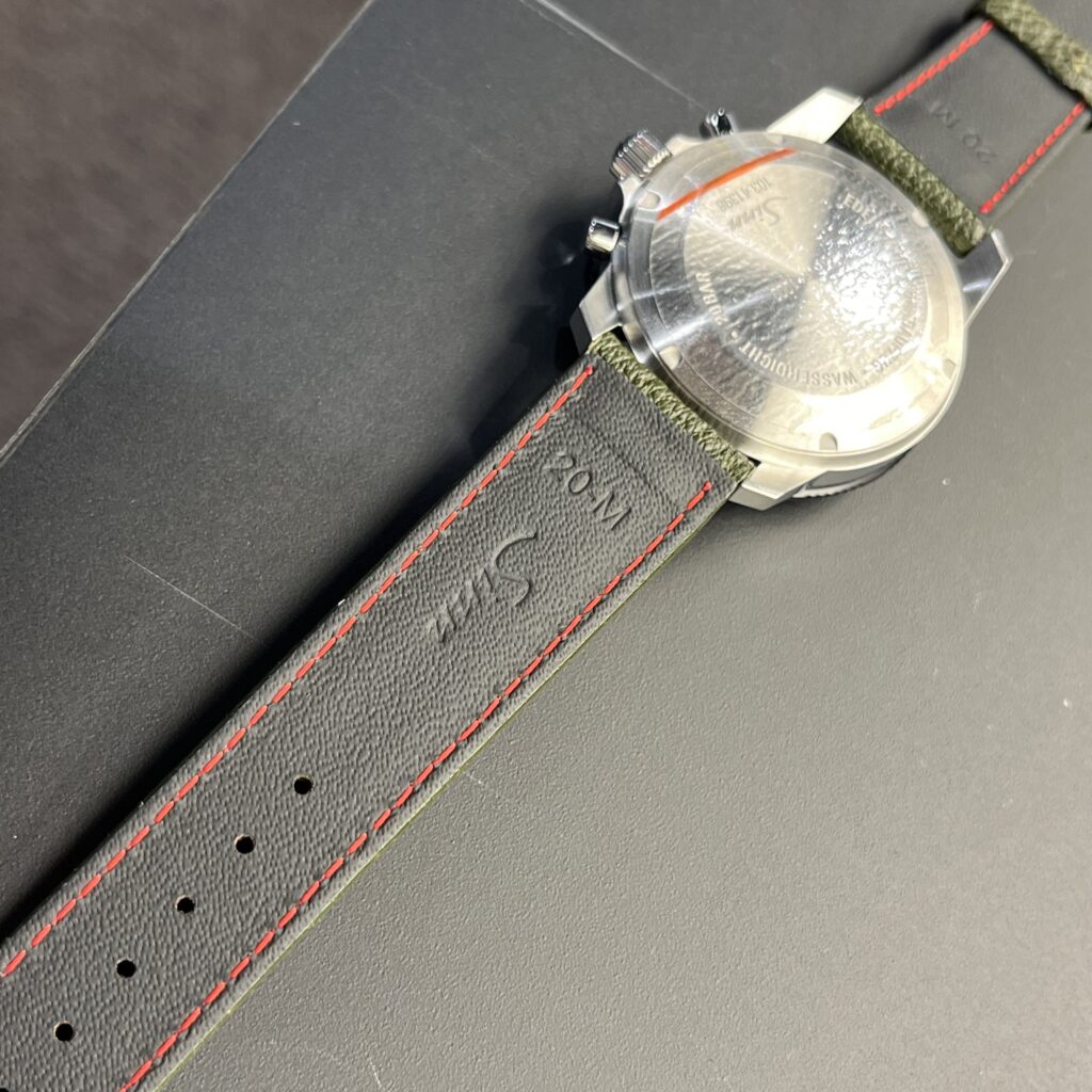 このモデルは世界1,000本のみの生産。裏蓋にはシリアルナンバーが刻まれており、自分だけの一本であることを実感できます。付属品も充実しており、ブラックとオリーブグリーンの2本のレザーストラップ、工具、替えバネ棒などが専用ボックスに収められています。