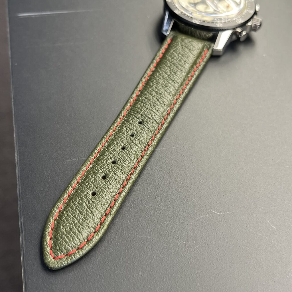 落ち着きのあるグリーンのボアレザーに反対色の赤いステッチが綺麗にはいり、そこもまたハイセンスな組み合わせですね。
