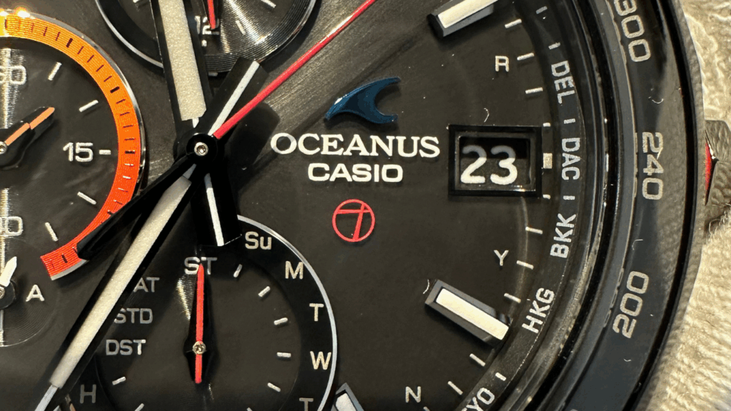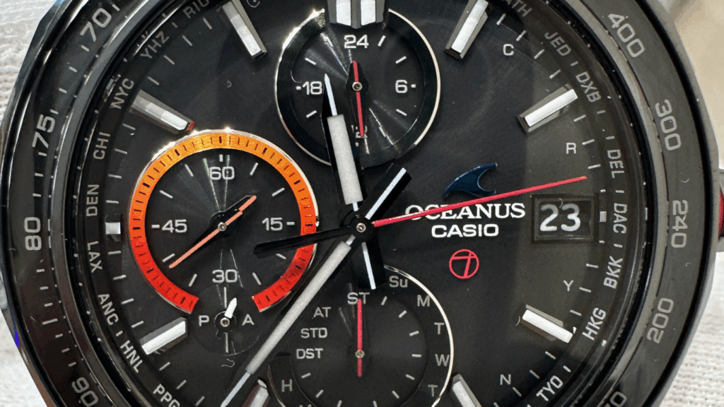 「赤系」のカラーリングを採用したモデルは圧倒的に少なく、オシアナスの中でもビジュアルでいえばかなり珍しいモデルとも言えます。