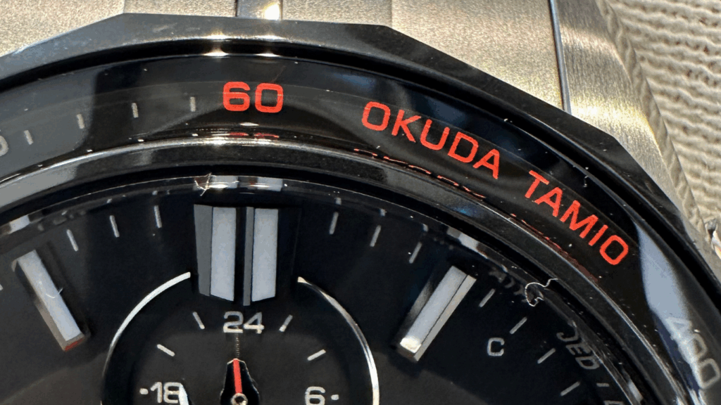 Manta S7000シリーズがクロノグラフモデルであるためレギュラーモデルのサファイアガラスのベゼルは、時速を測る「TACKY METER(タキメーター)」表示になっているのですが、こちらは「OKUDA TAMIO」と赤文字にて表記されています。