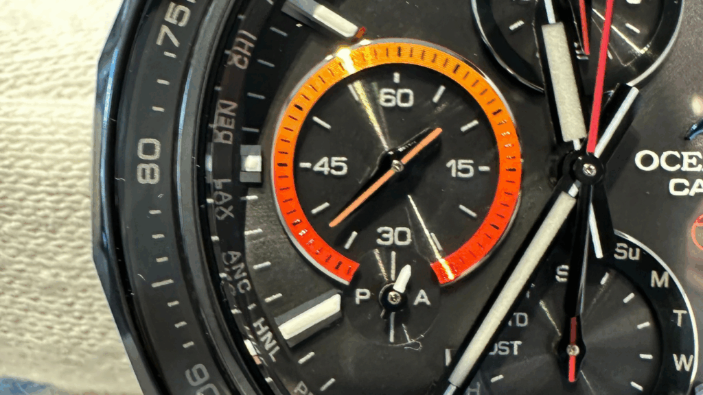ダイアル内の9時方向にあるインダイアルリングはオレンジと赤のグラデーションがスポーティな印象を強調させます。