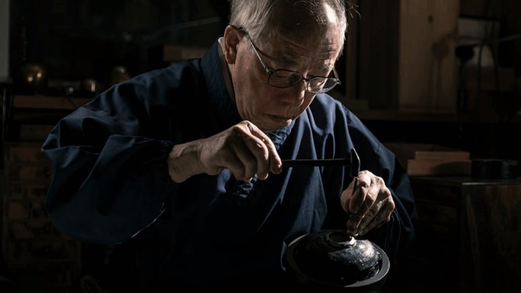 小林正雄氏は彫金師として活動しており、神社仏閣の金具の制作や文化財の復元のほか、茶道具や美術工芸品など、幅広い分野の錺金具(かざりかなぐ)製作で活躍しています。