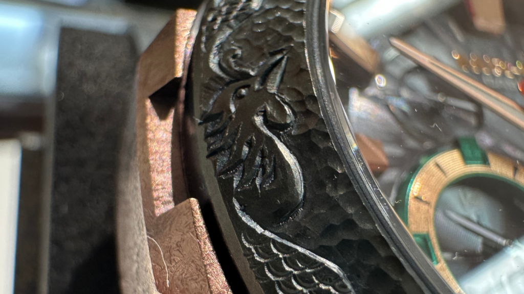 こちらの鐔の柄である『鳳凰』を、MR-Gのベゼルに小林正雄氏が手掘で彫りこみ、