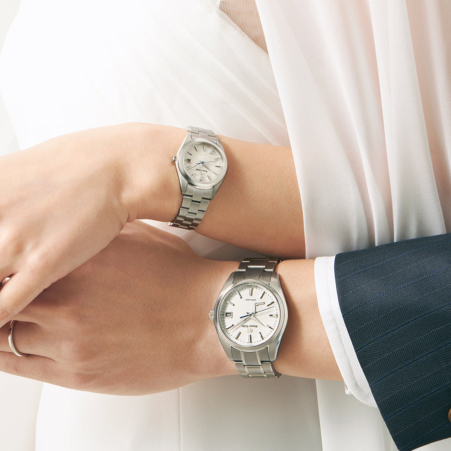 サイズは横 28.9mm 縦 35.4mm 厚さ 8.7mm女性の手首に美しく収まるデザインになっており、婚約記念やフォーマルシーンでも使える一本として女性のお客様から特に支持の高いモデルです。ぐっと小さくデザインされた「STGF359」ですが、雪白ダイヤル特有の立体的な表情は健在。小さくなっても、グランドセイコーらしい上質さはしっかりと感じられます。