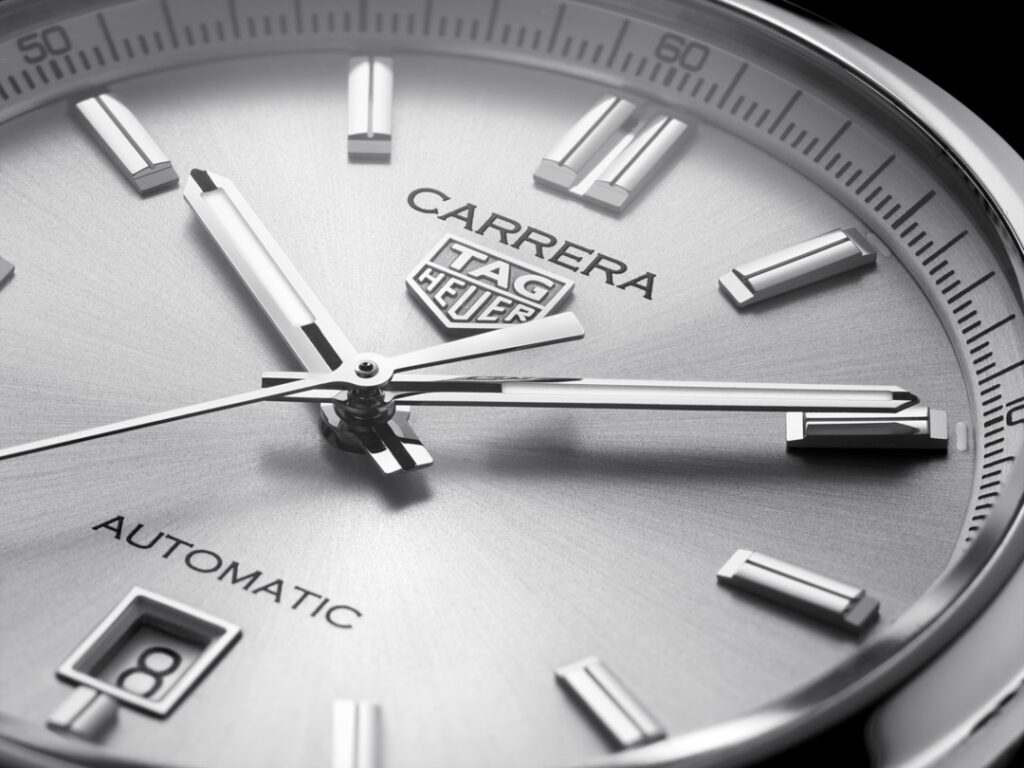 カレラらしいすっきりとしたダイヤルに、サンレイ仕上げのホワイトが組み合わさり、